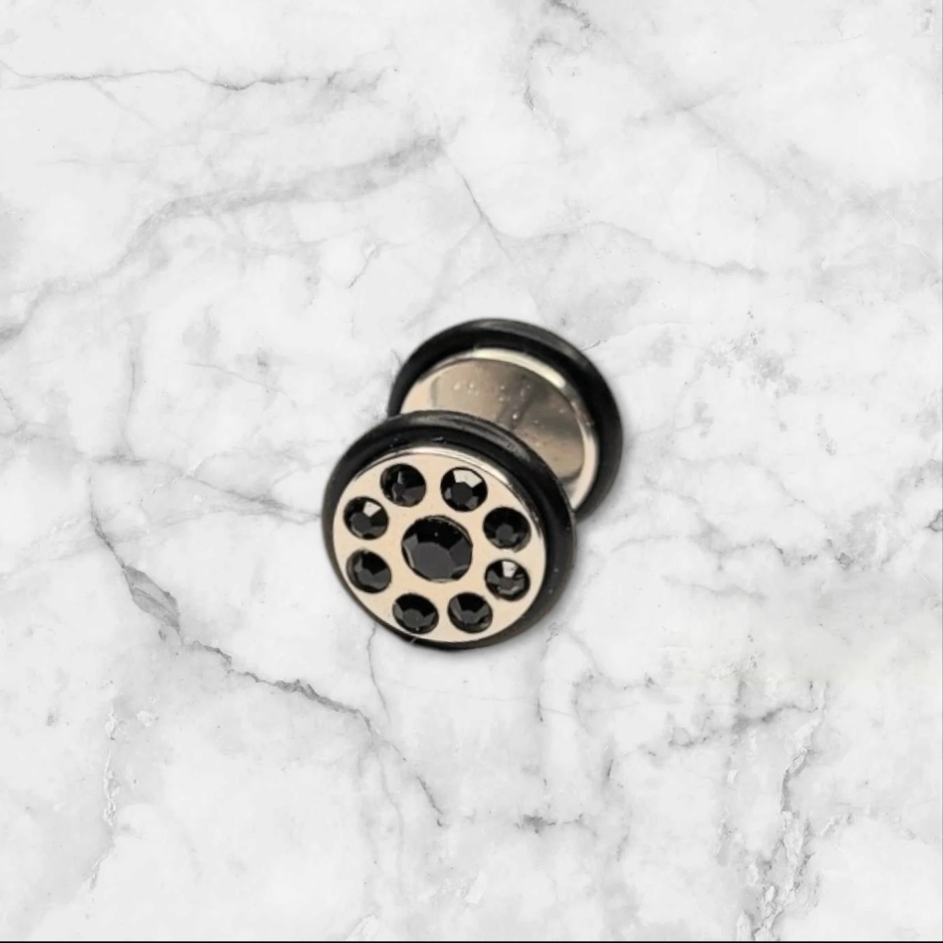 PIERCING DE ACERO QUIRURGICO FALSO EXPANSOR STRASS NEGRO CON CAUCHO X 8 MM.